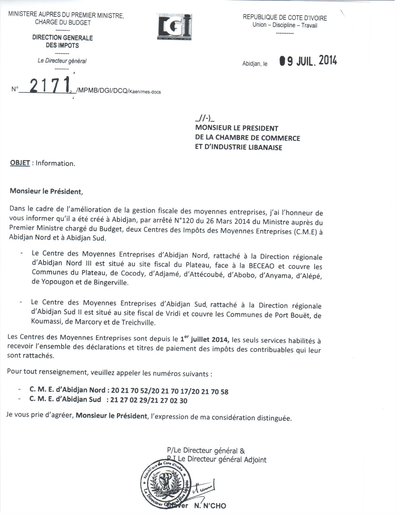 Le Directeur général des Impôts précise que depuis le 1er juillet 2014, les Centres des moyennes Entreprises sont les seuls services habilités à recevoir l’ensemble des déclarations et titres de paiement des Impôts des contribuables qui leur sont rattachés.