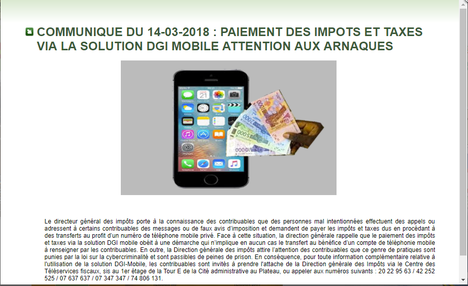 Attention aux arnaques dans le paiement des impôts et taxes via la solution DGI-Mobile