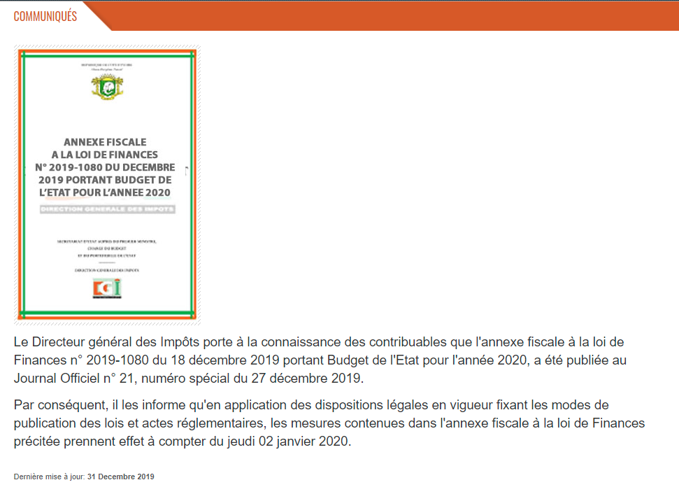 Entrée en vigueur de l’Annexe Fiscale 2020