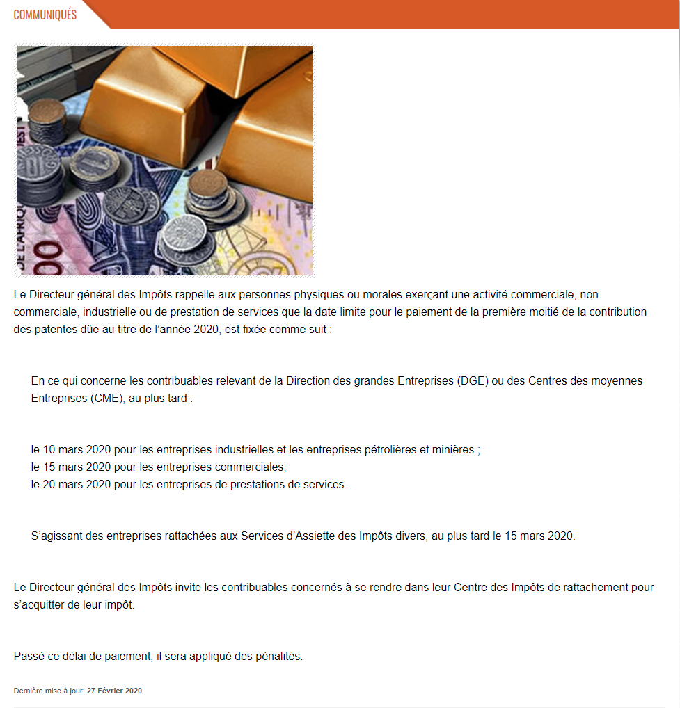 Les dates limite pour le paiement de la première moitié de la contribution des patentes au titre de l’année 2020