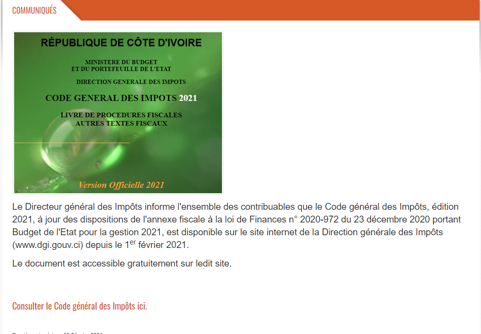 Le code général des impôts édition 2021 disponible sur le site internet de la DGI